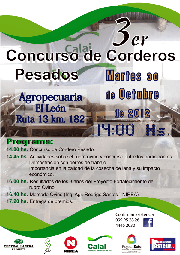 El próximo martes 30 de Octubre de 2012 a la hora 14 se realizará en la Agropecuaria El León (Ruta 13 km 182) el 3er Concurso de Cordero Pesado que realiza CALAI con el apoyo de Central Lanera Uruguay, Laboratorio Pasteur, Secretariado Uruguayo de la Lana.